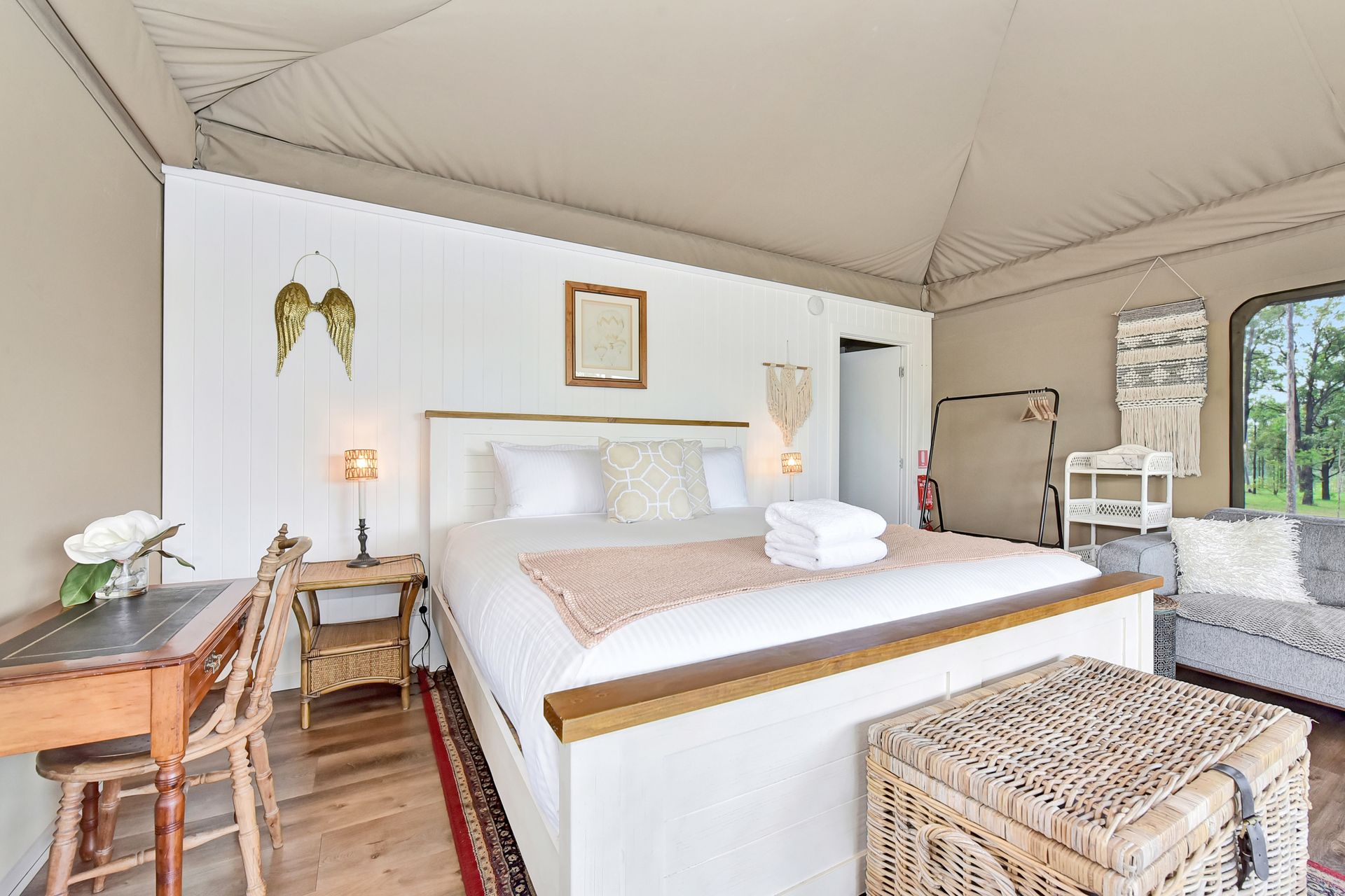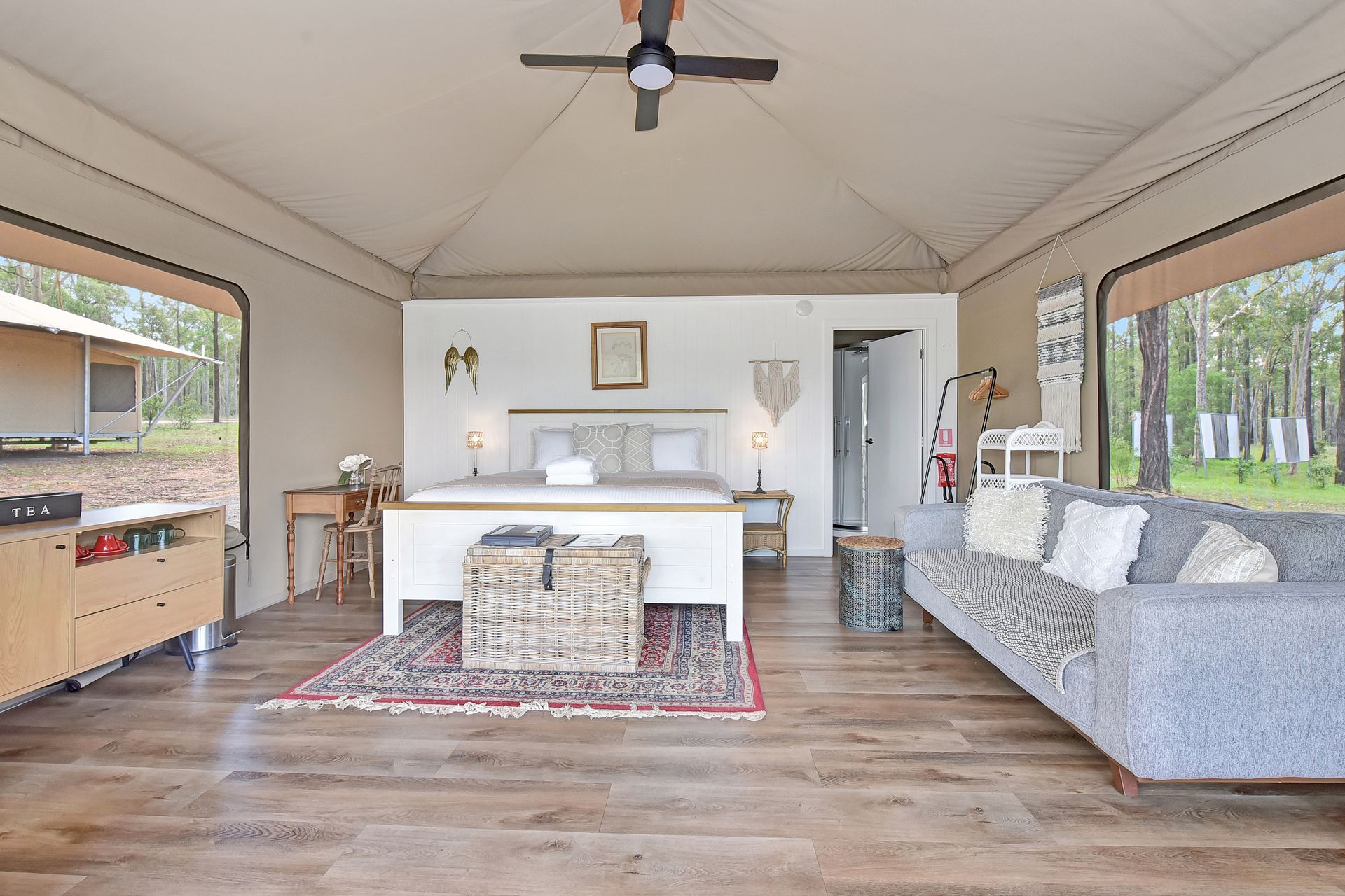 Experience romantic luxury amidst the serene beauty of Australia’s Hunter Valley at our eco-friendly glamping retreat, the perfect escape for two. Nestled in the heart of wine country, our accommodations offer a unique blend of comfort and adventure, all while running off-grid with solar energy. Our glamping tents provide an unforgettable escape into nature's embrace, featuring stunning mountain, rural, and bush views.