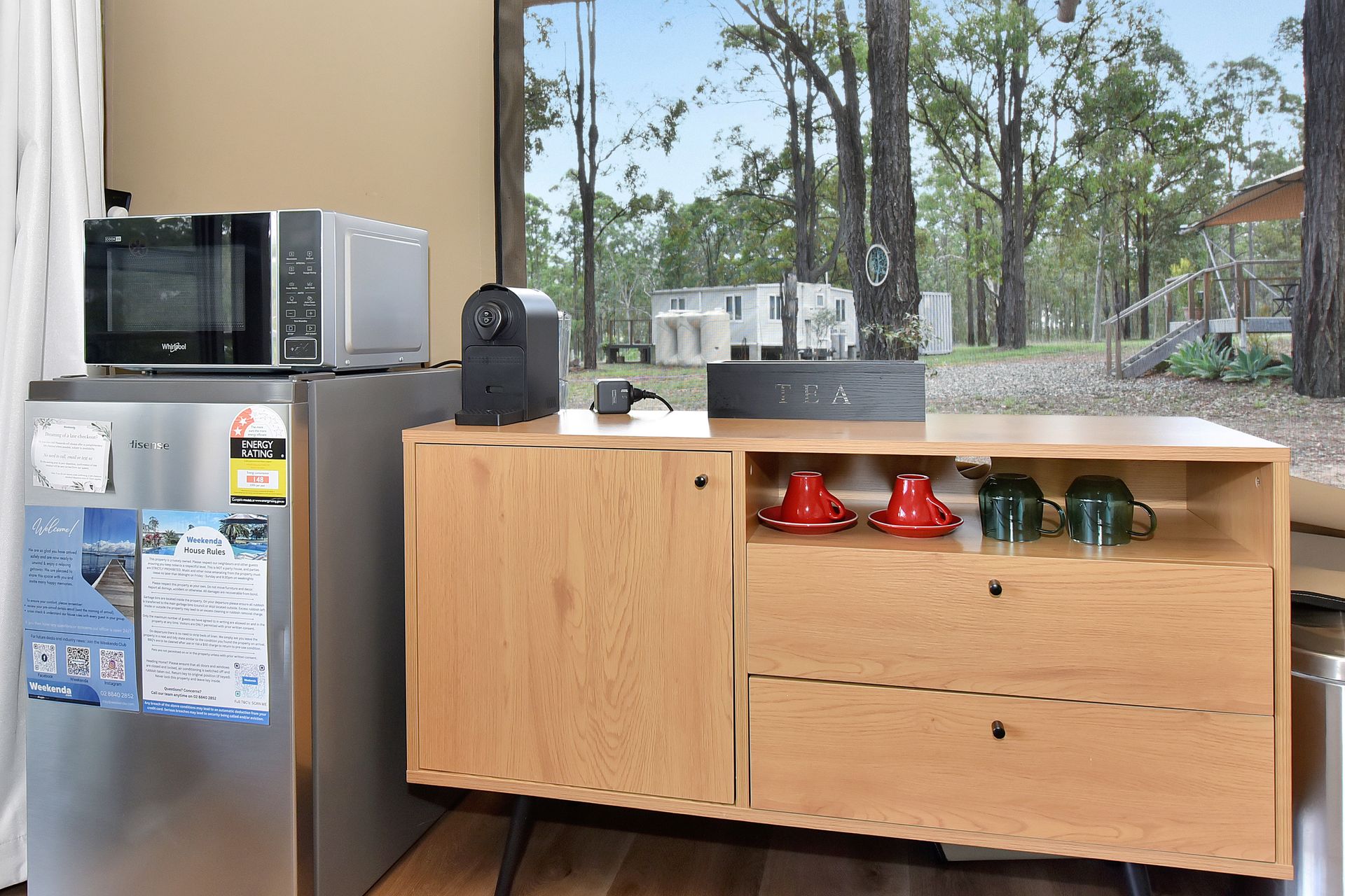 The kitchenette is equipped with a fridge, microwave, kettle, plates, cutlery, cups, and a coffee machine.