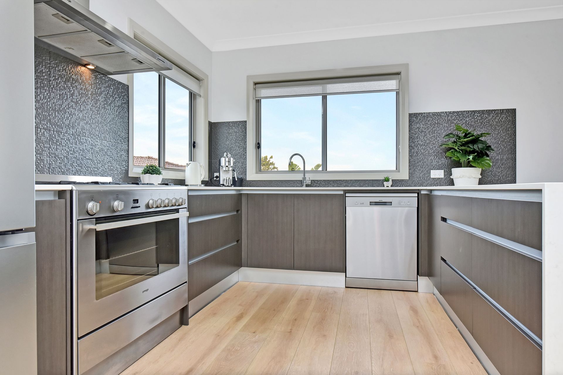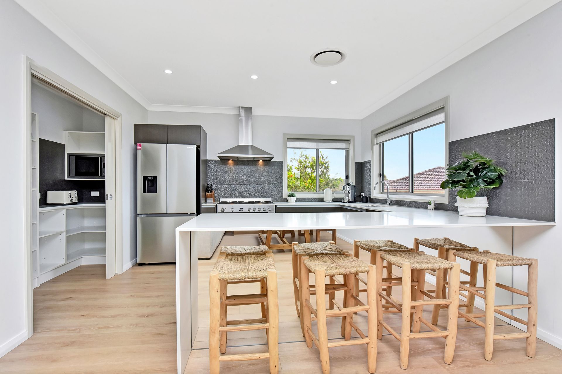 Fully equipped modern kitchen with a gas cooktop, large fridge, and walk-in pantry, Delonghi coffee machine, toaster and kettle