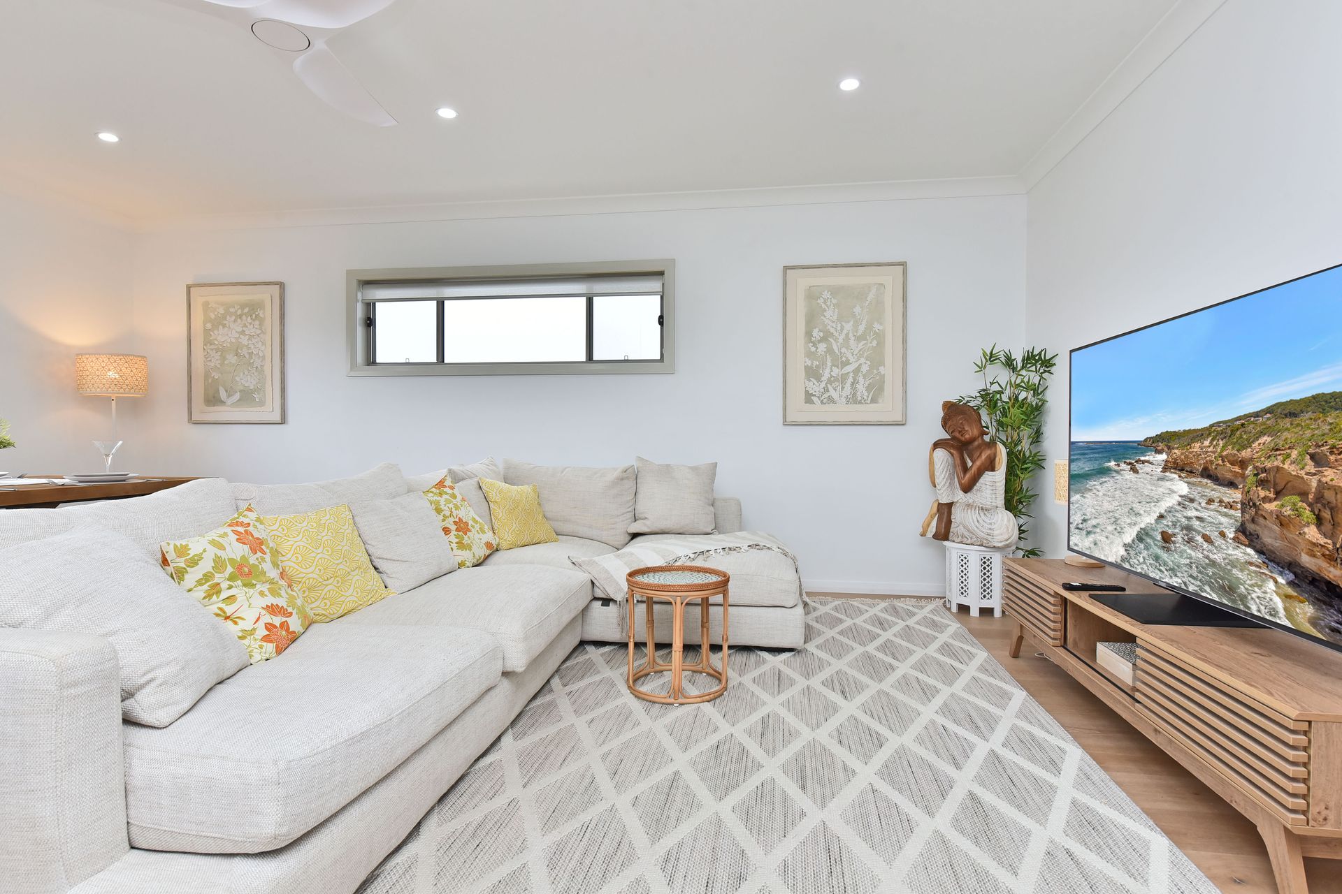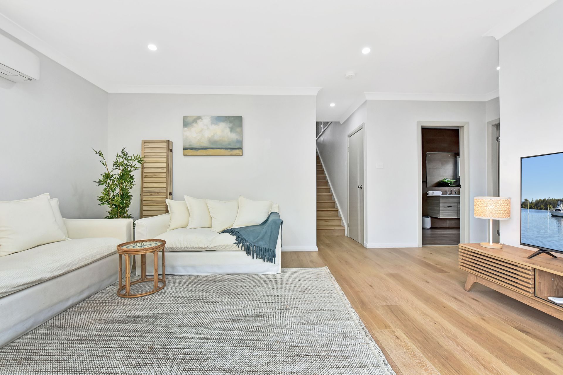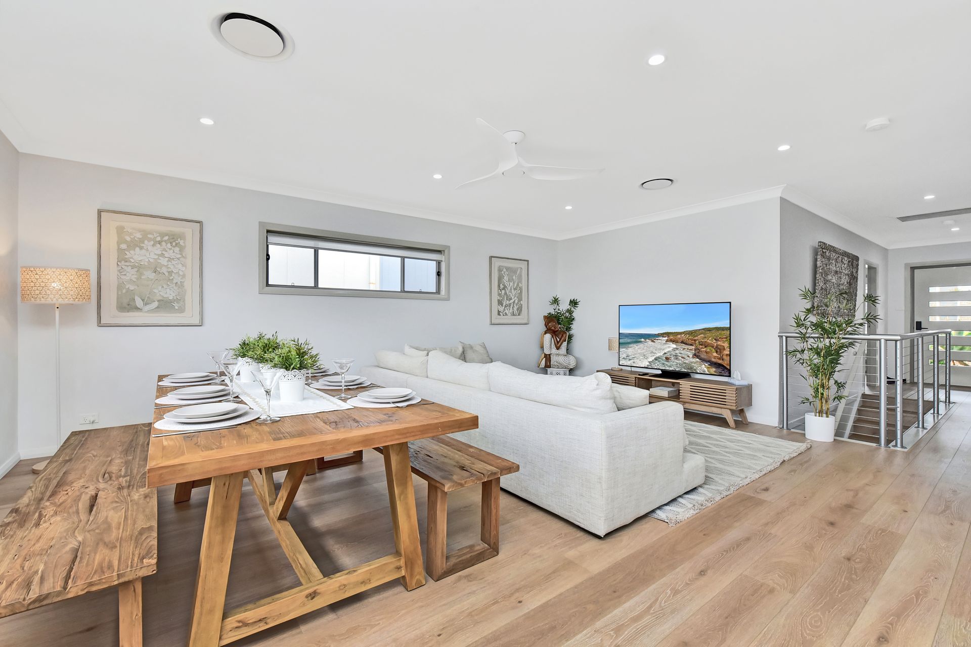 Combined lounge and dining area with a large flat-screen TV (ducted Air Conditioning on Ground Floor)