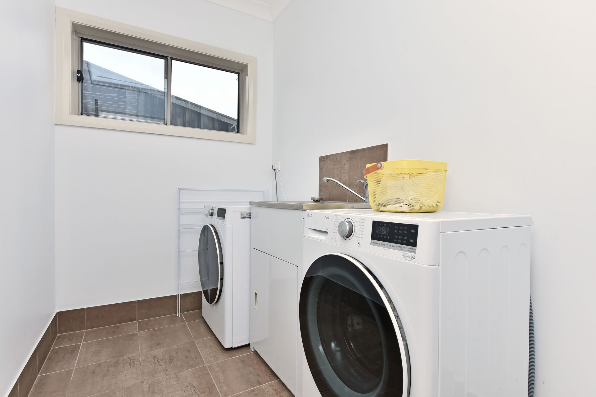Internal laundry with a washing machine, dryer, clothesline, iron, and ironing board