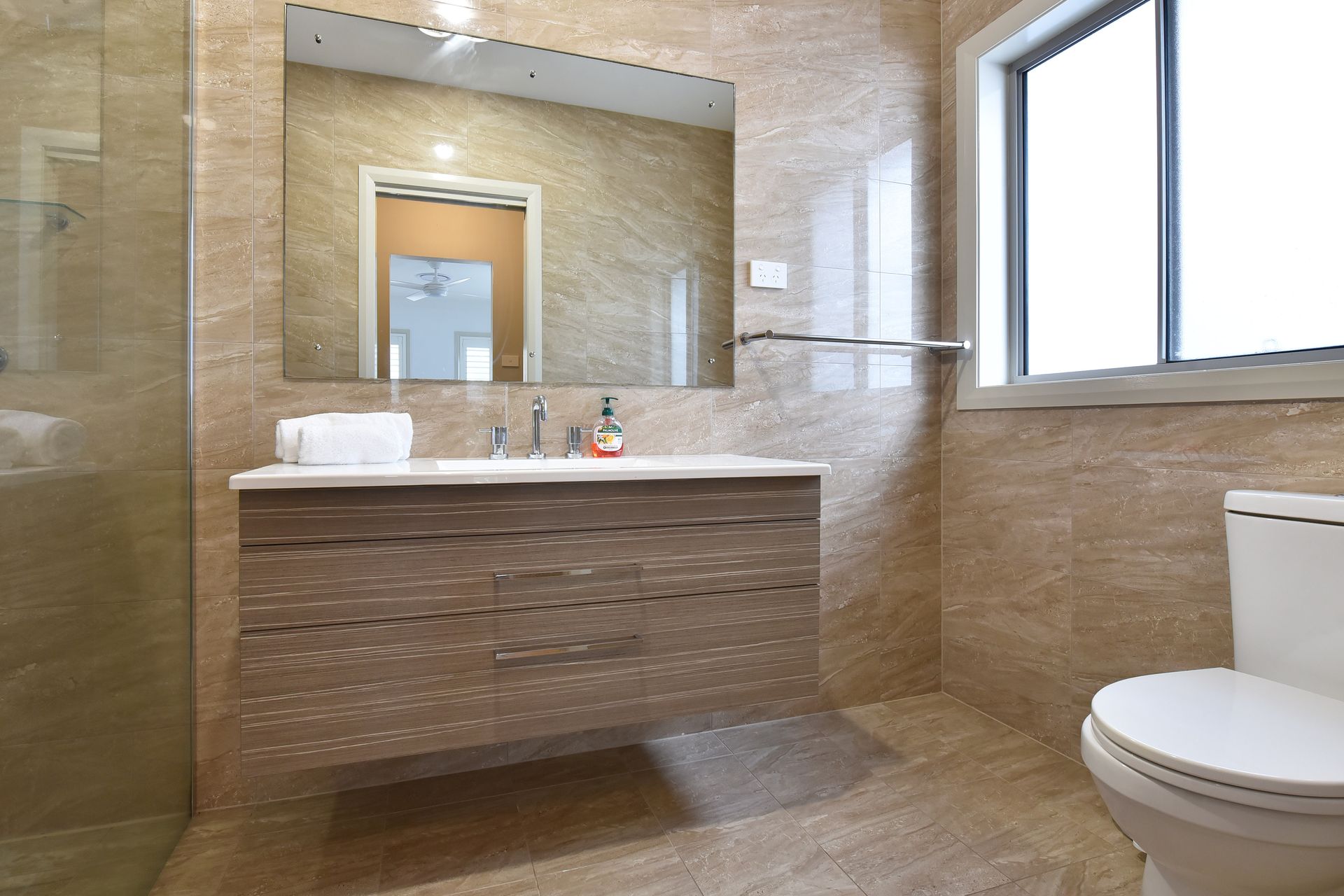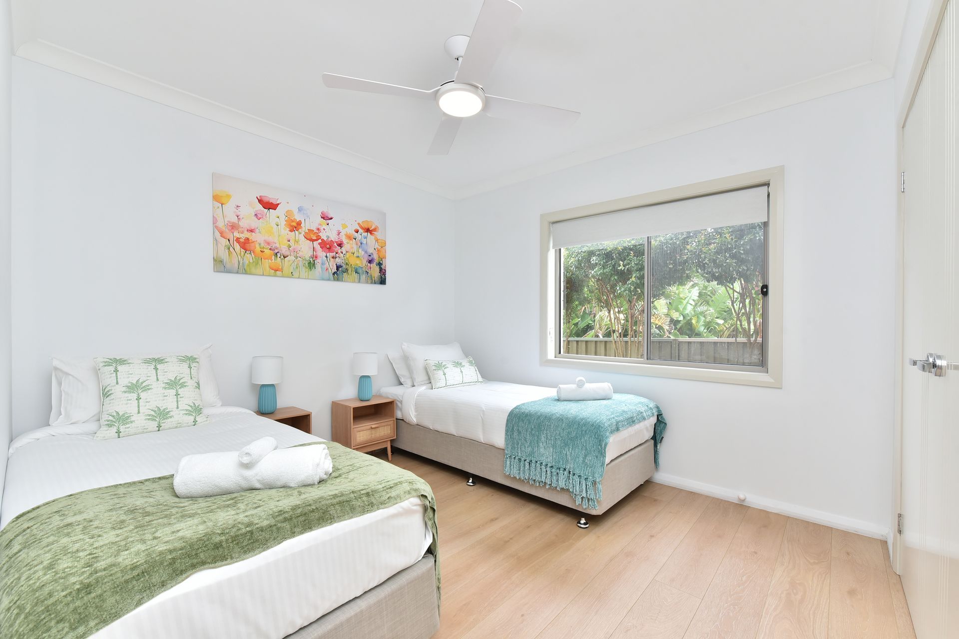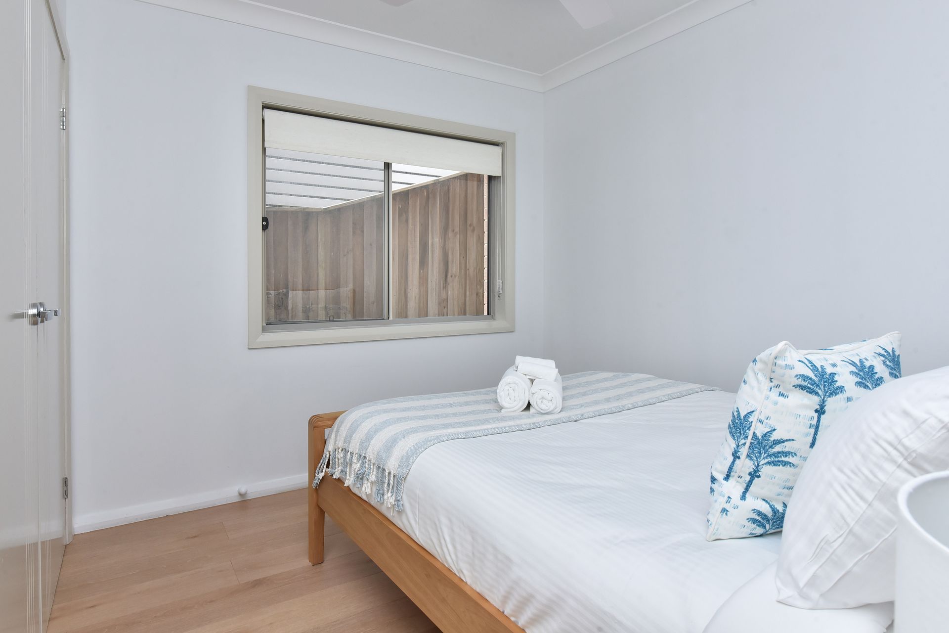 Bedroom 3: Lower Ground Floor – Split single beds (or King set up upon request), built-in robe, ceiling fan, and roller blind.