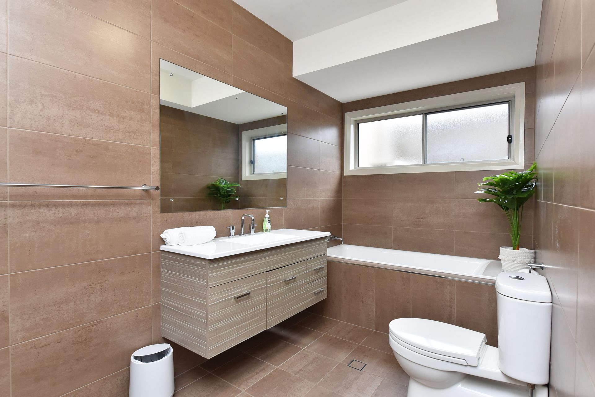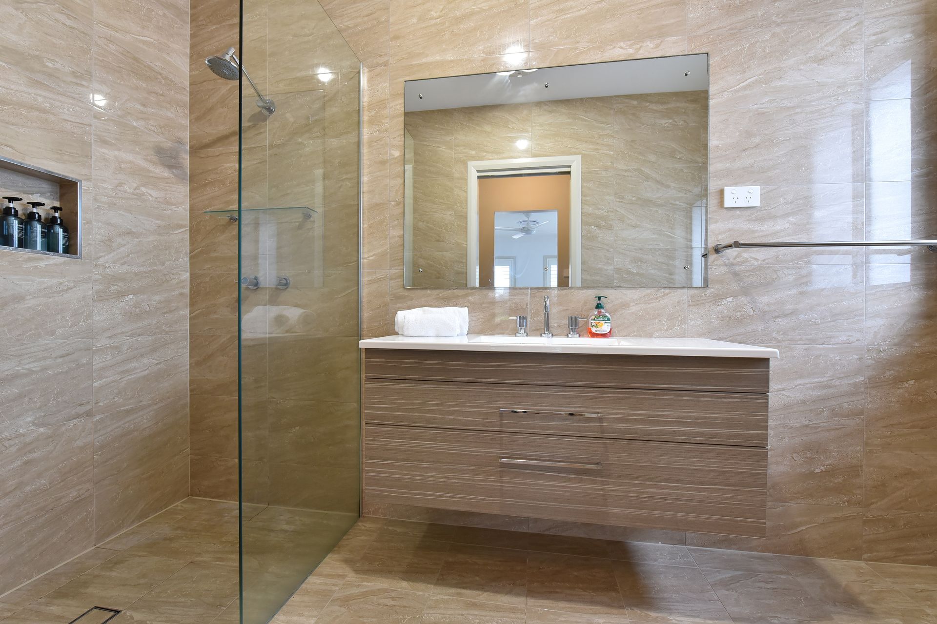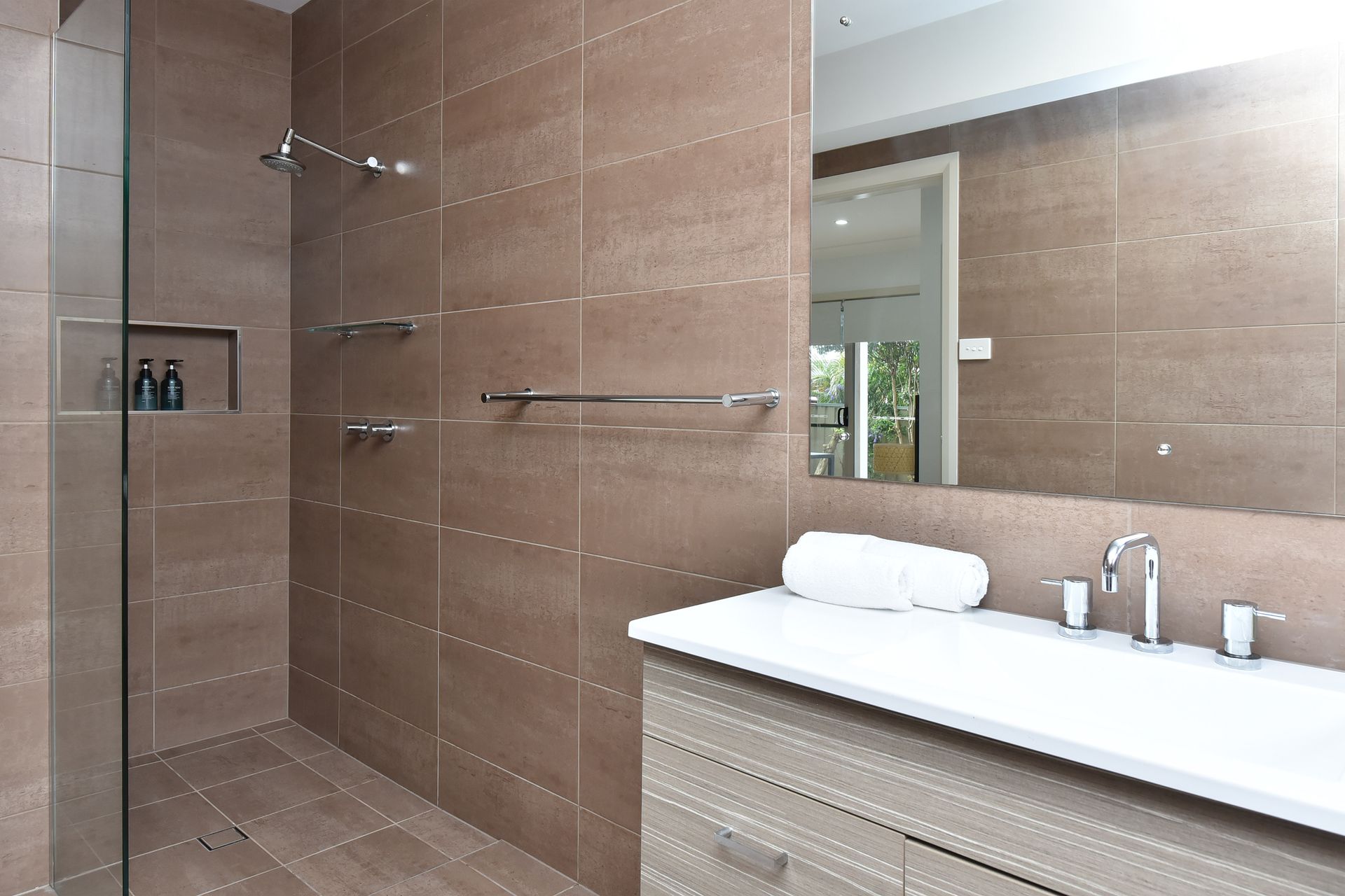 Bedroom 3: Lower Ground Floor – Split single beds (or King set up upon request), built-in robe, ceiling fan, and roller blind.