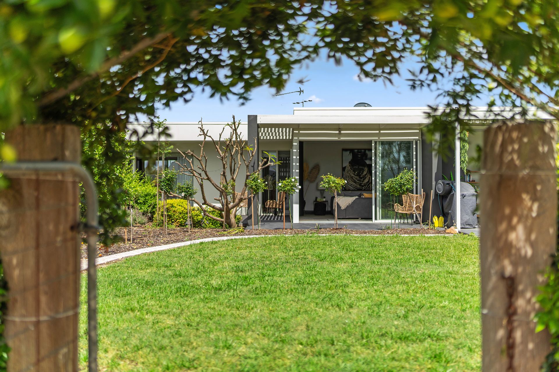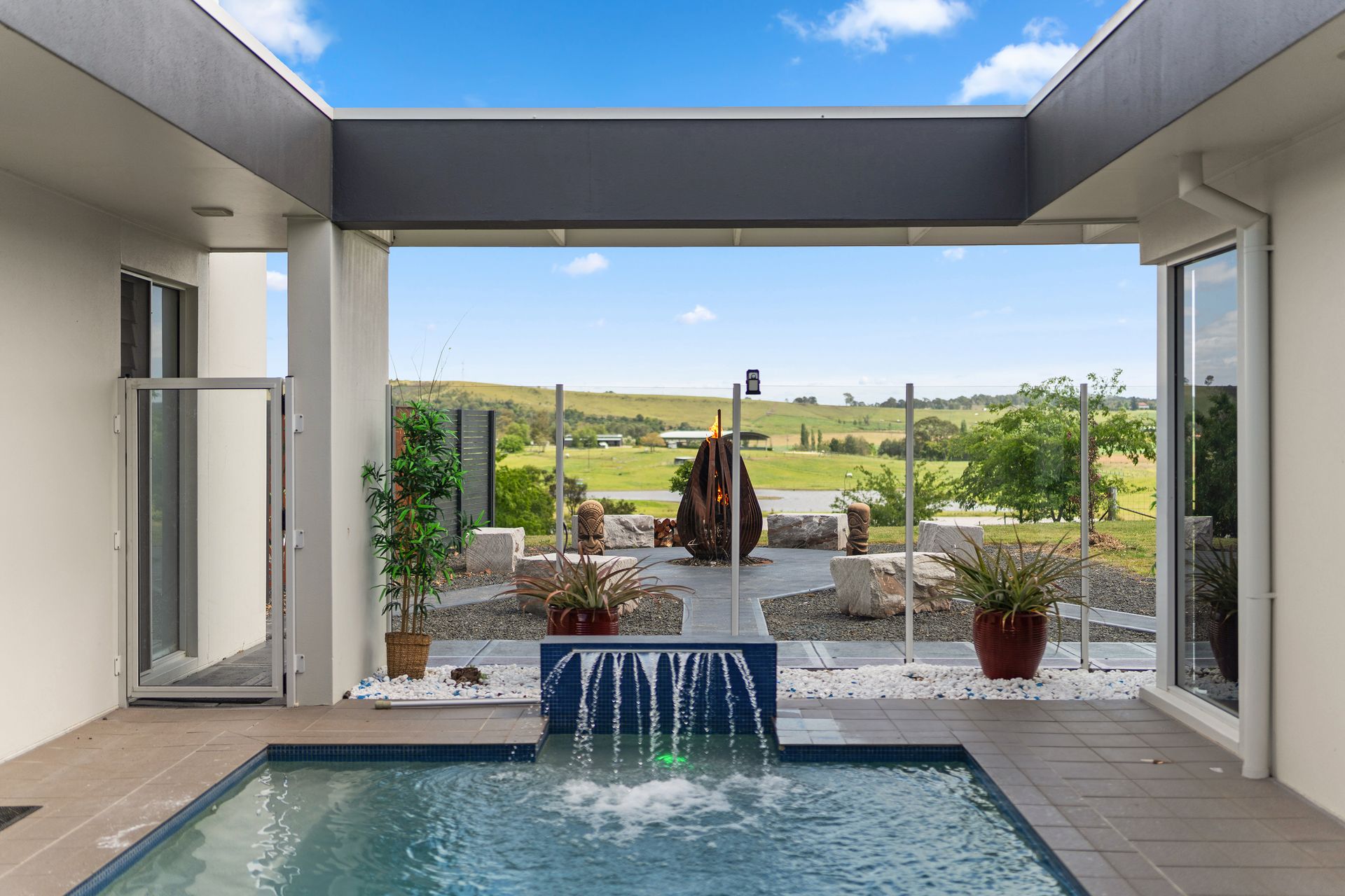 The house is divided by a pool and is beautifully furnished, overlooking farmland that stretches down to the Hunter River.