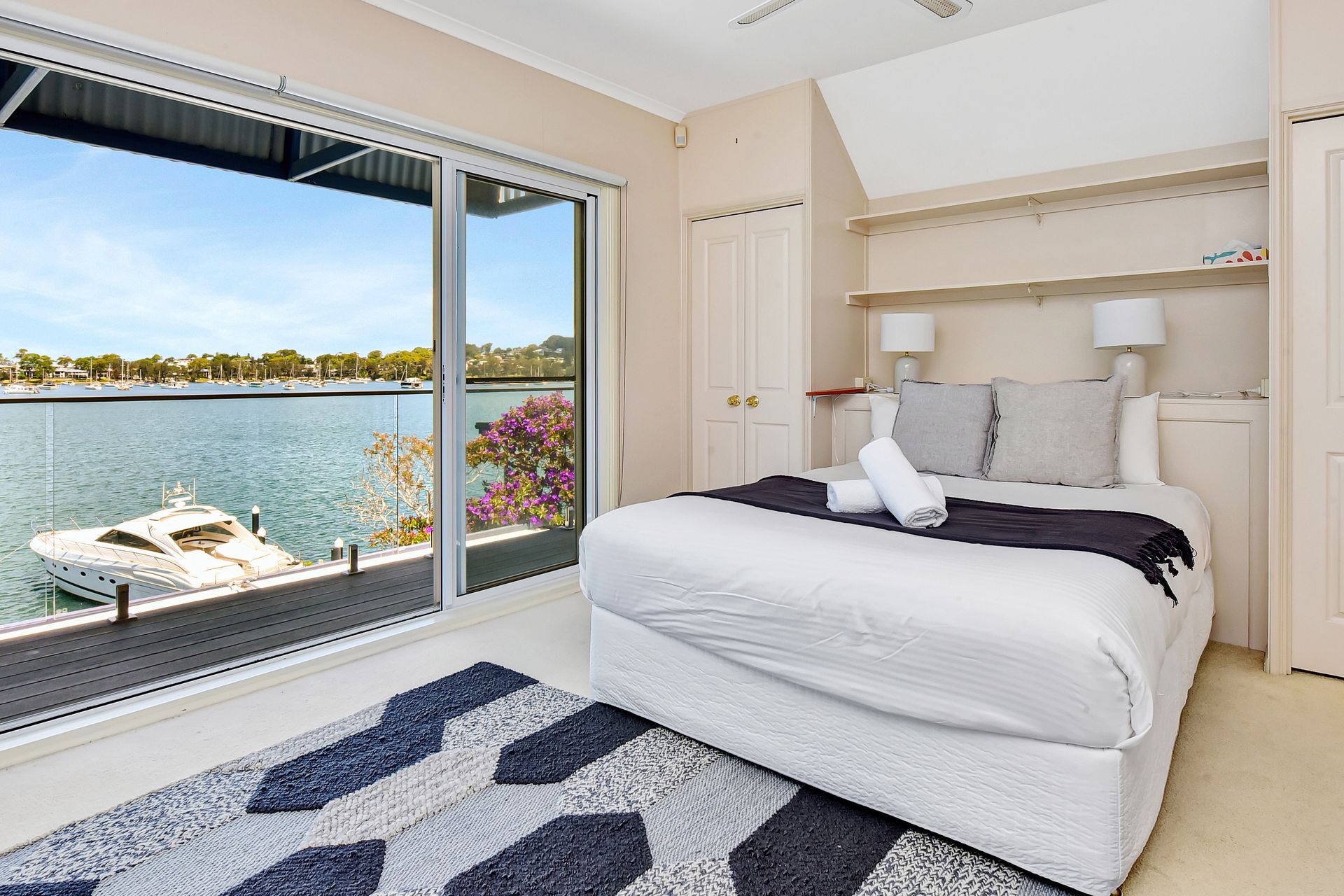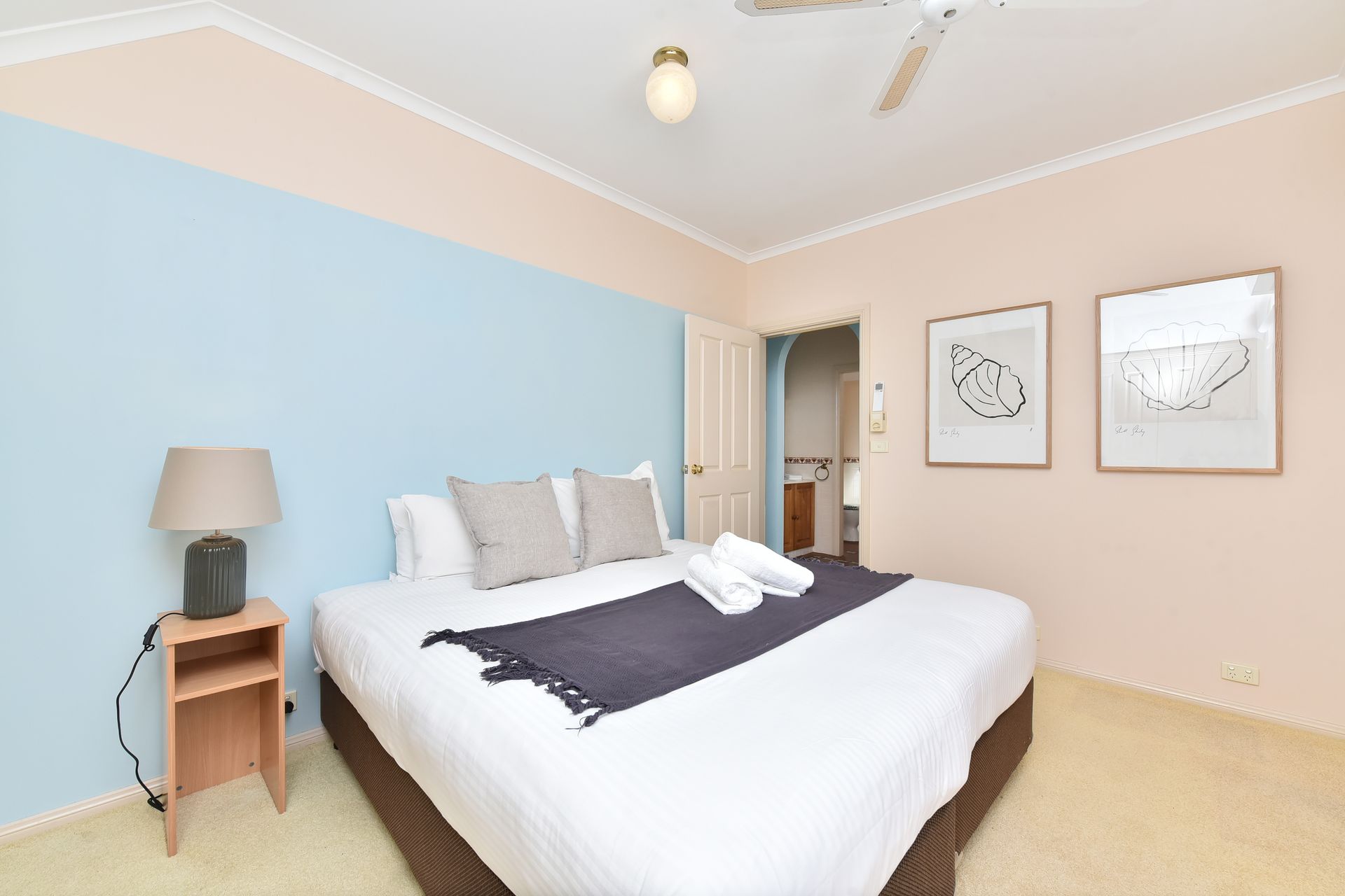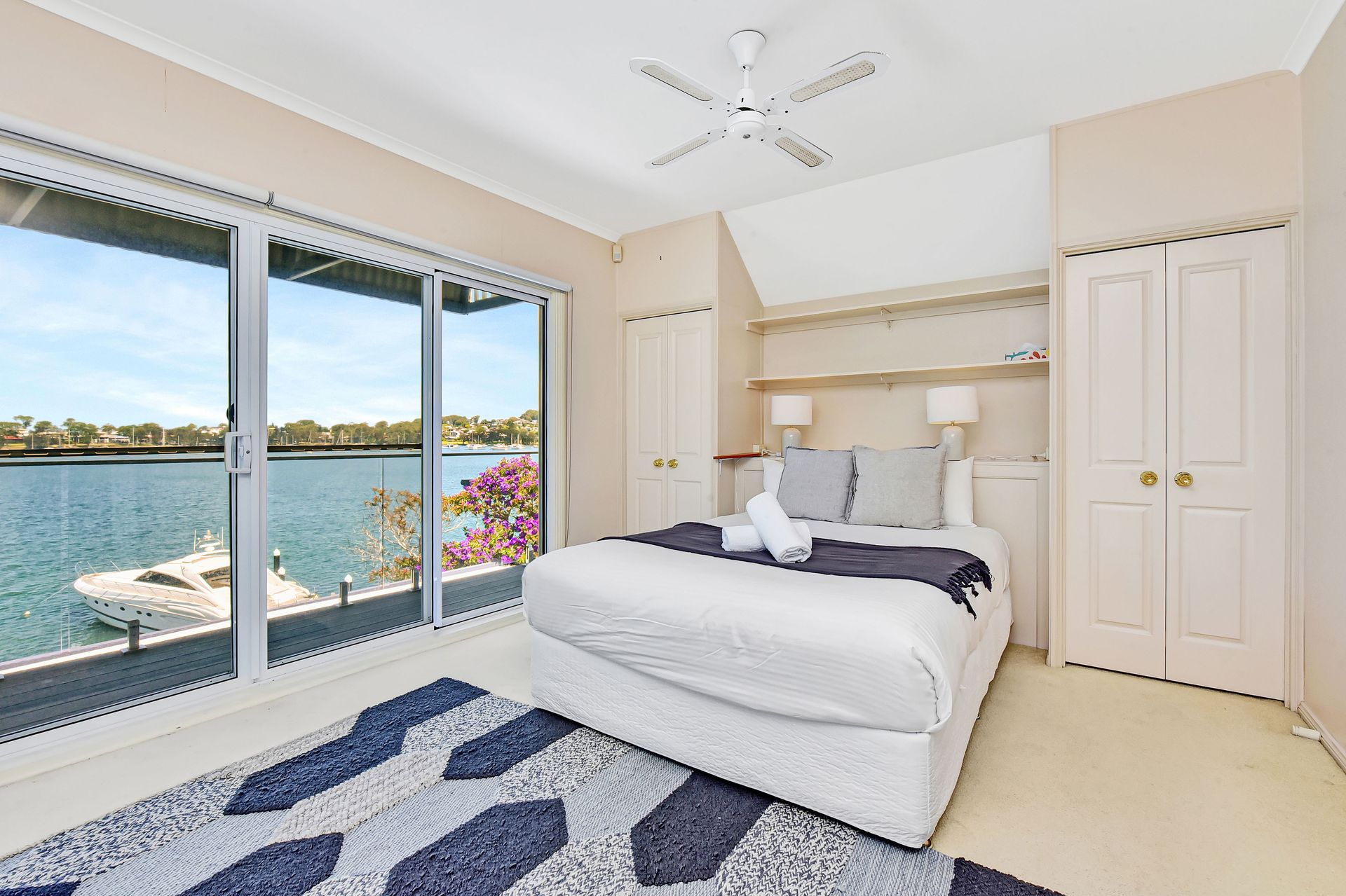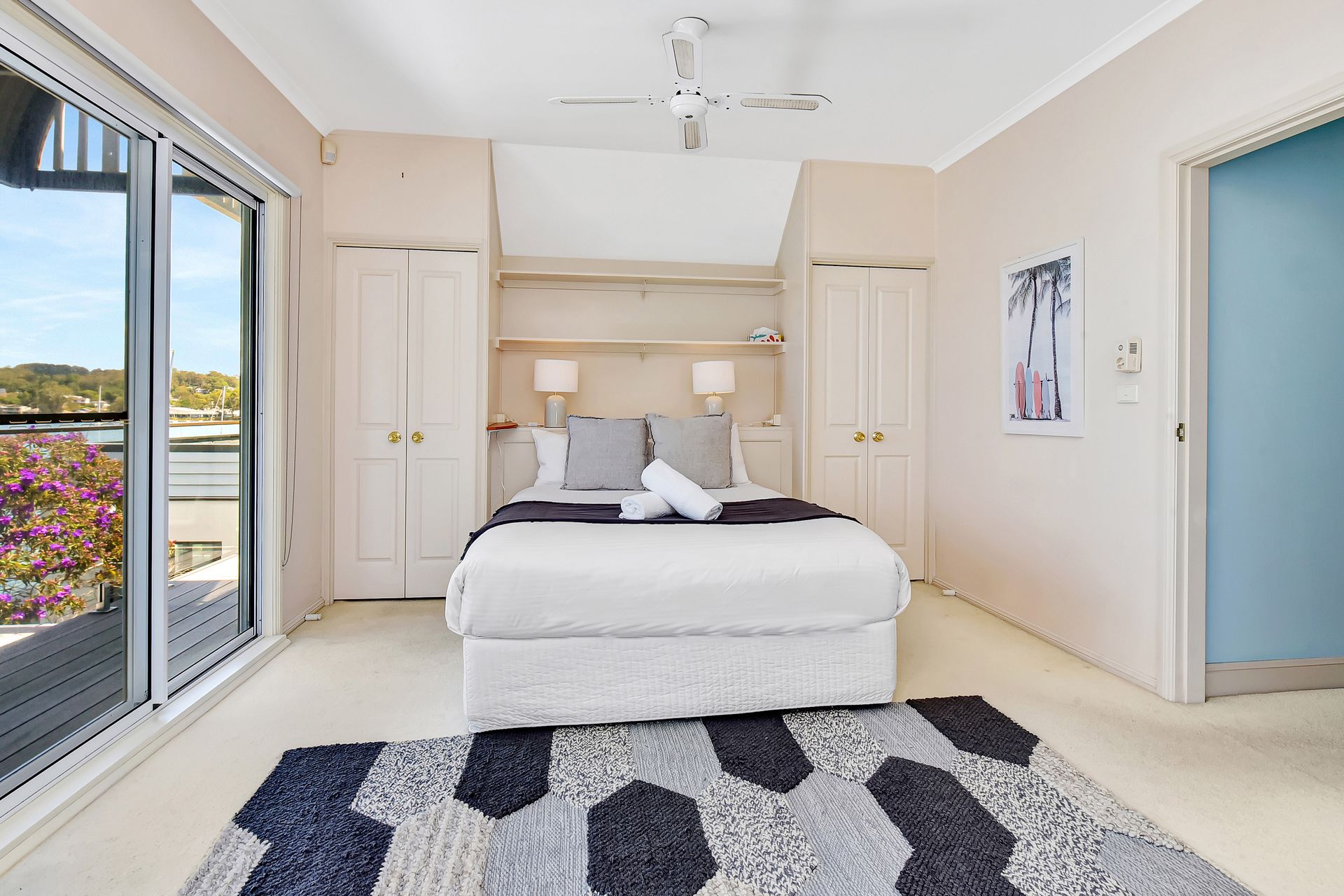 Bedroom 1: Queen Bed, Balcony Access, Built in Robe, Private Balcony, Ceiling Fan