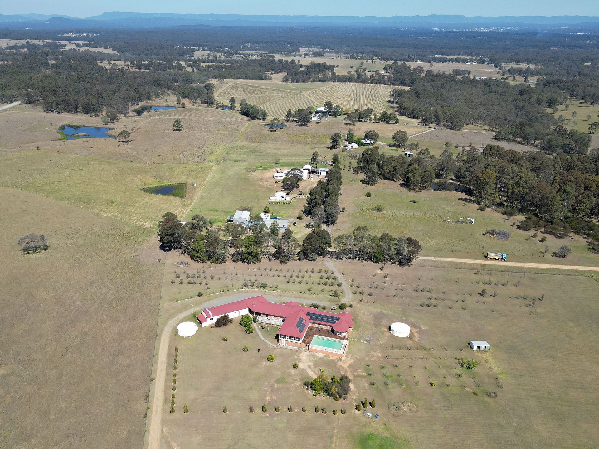 Located in the boutique Lovedale wine region, this grand residence blends timeless elegance with modern comfort. The homestead features a spacious, fully equipped country kitchen, formal dining and sitting rooms designed for entertaining, and a generous games room complete with pool table and darts. A cozy combustion fireplace adds warmth in the cooler months, while the showstopping infinity-edge pool invites you to relax and unwind in the summer sun.