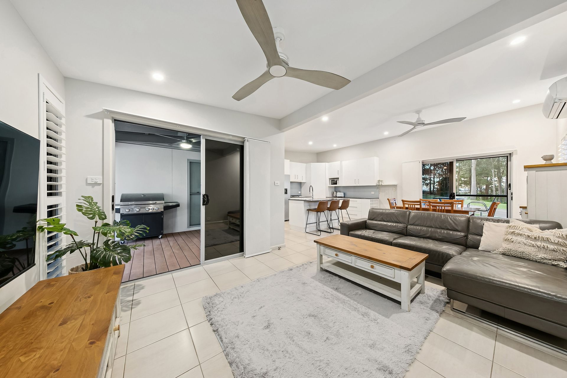 Inside, you’ll find bright open-plan living with elegant décor and contemporary furnishings. The stylish kitchen is fully equipped with quality appliances, while the adjoining dining and lounge areas provide a welcoming space to gather and relax. With high-speed internet, a smart TV with streaming services, and year-round comfort through air conditioning and ceiling fans, this home offers everything needed for an effortless stay.