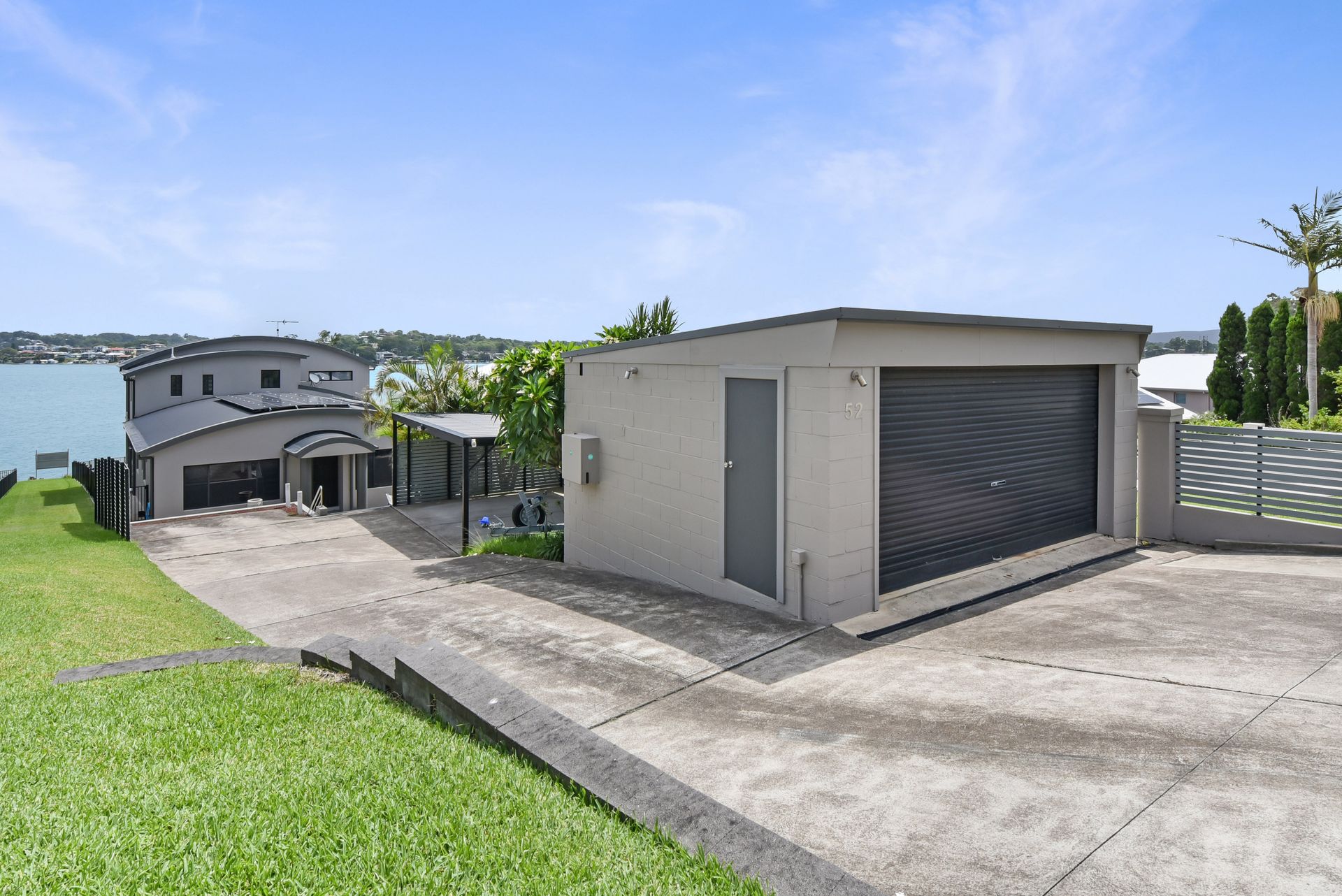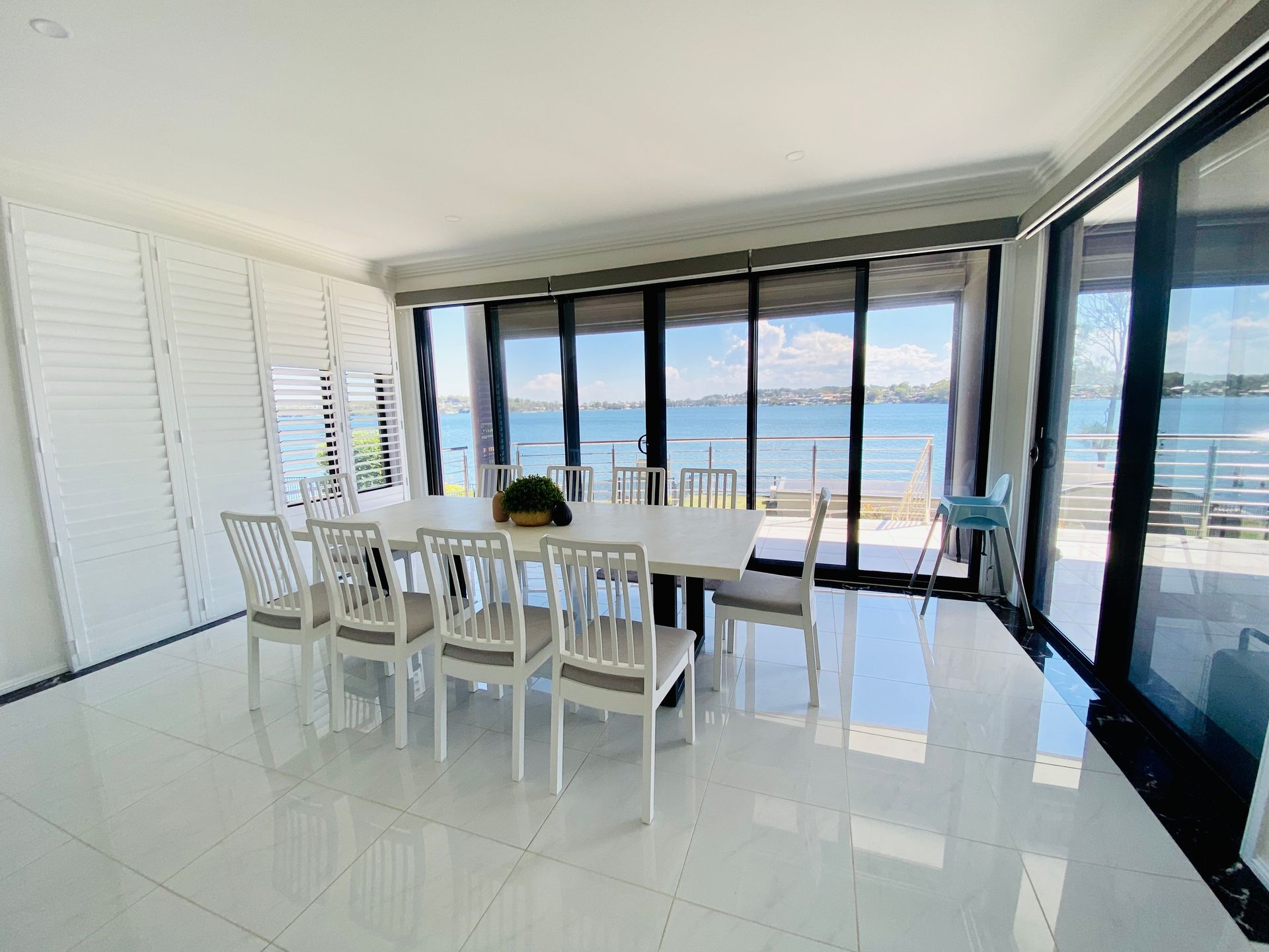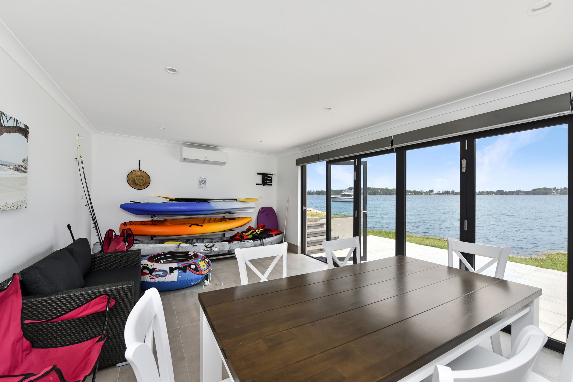 Enjoy panoramic water views from the expansive lounge, dining, and kitchen areas, all overlooking the boathouse, boatshed, and the sparkling blue waters of Lake Macquarie.