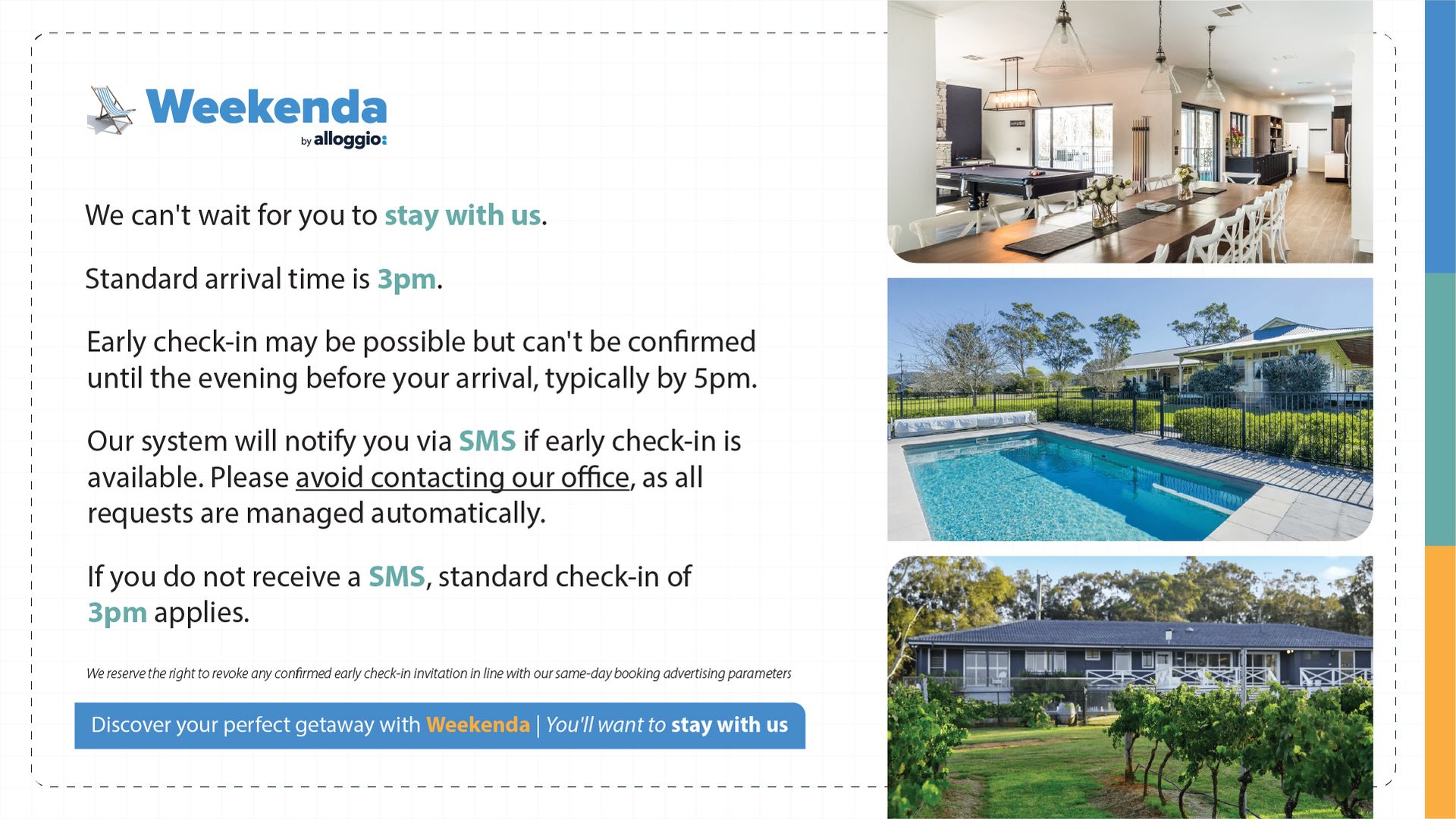 Guest Registration / ID Check : Weekenda requires every guest to complete and sign an electronic guest registration prior to arrival which will ask for photo ID i.e. a copy of your Drivers Licence or Passport. The primary booker will also be required to complete a list with the guests names and actual mobile numbers. In the event we are unable to reach the primary booker, it is very important we can get a hold of other guests. These documents will be deleted after your departure. Access Codes are only released to Registered and Verified Guests.