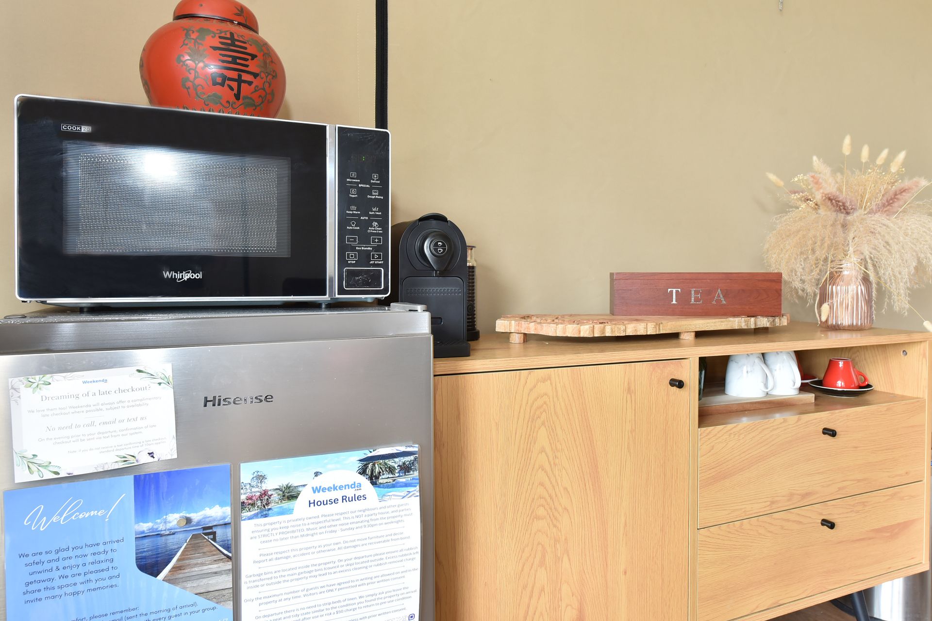 The kitchenette is equipped with a fridge, microwave, kettle, plates, cutlery, cups, and a coffee machine.