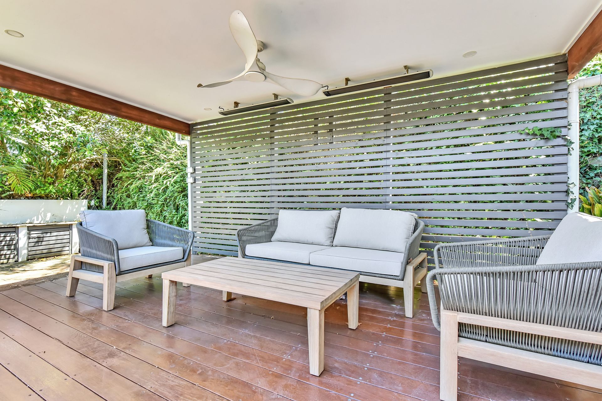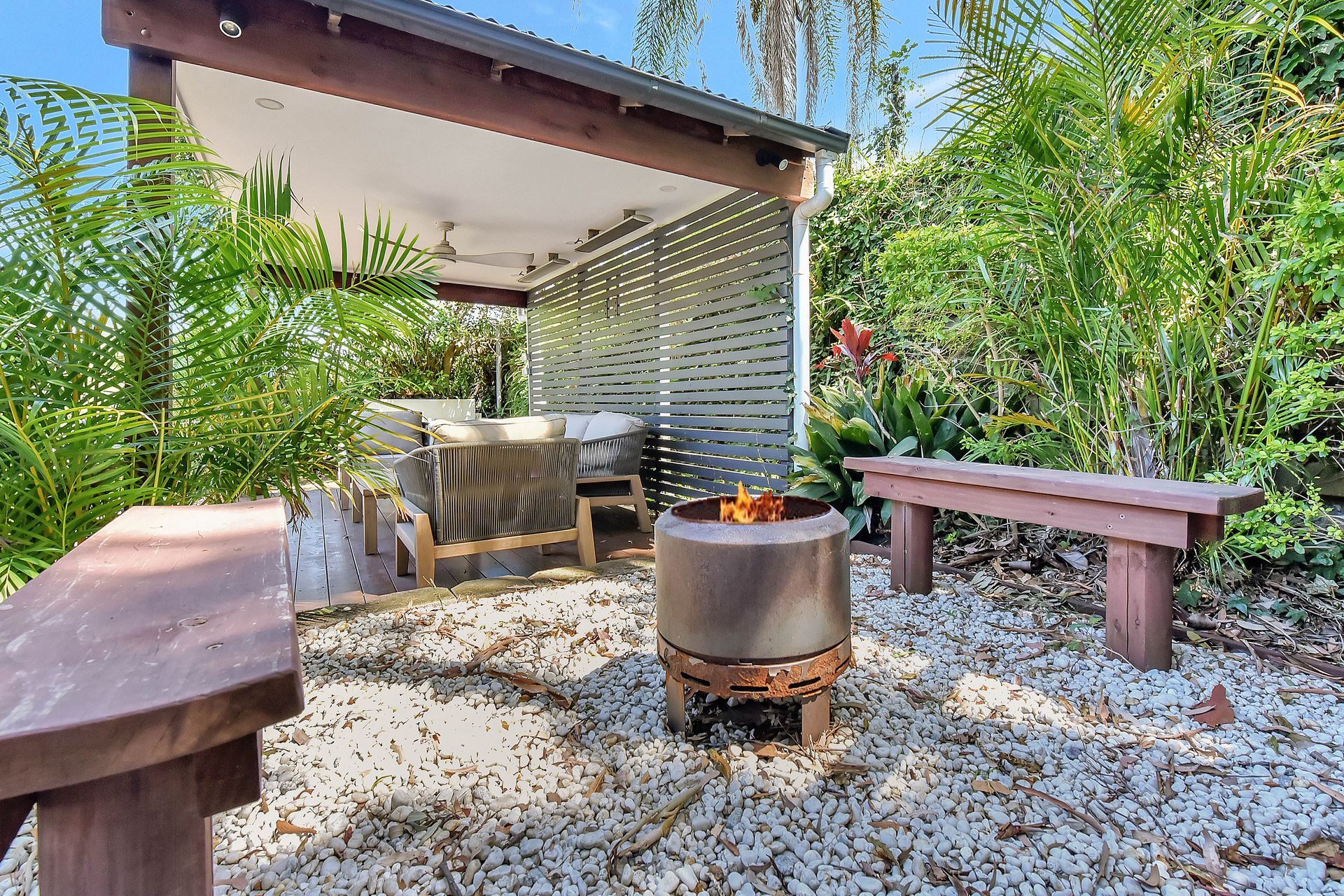 Backyard courtyard features seating area with overhead fan, fire pit, and 21 steps leading to the upper backyard where the basketball hoop is located.