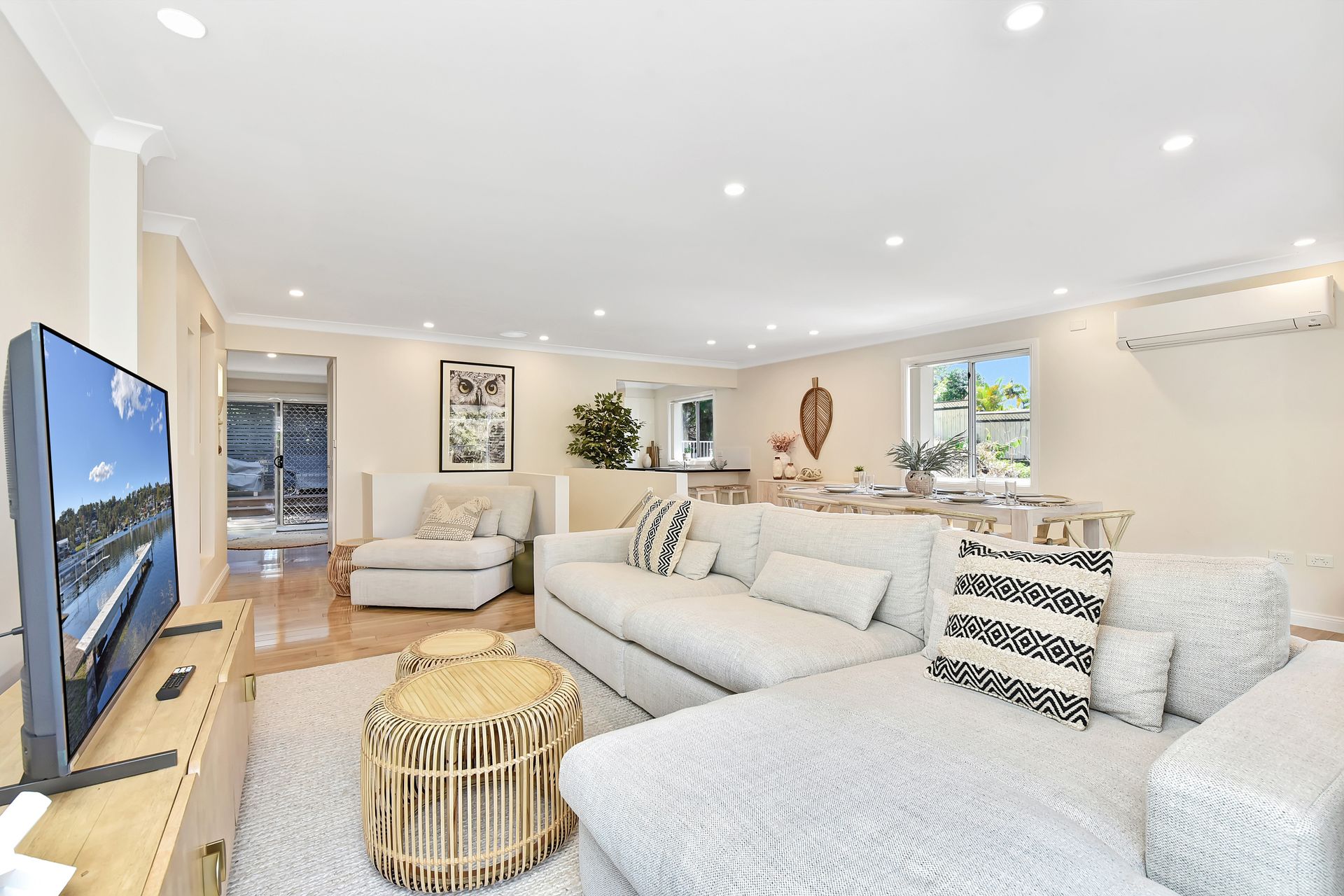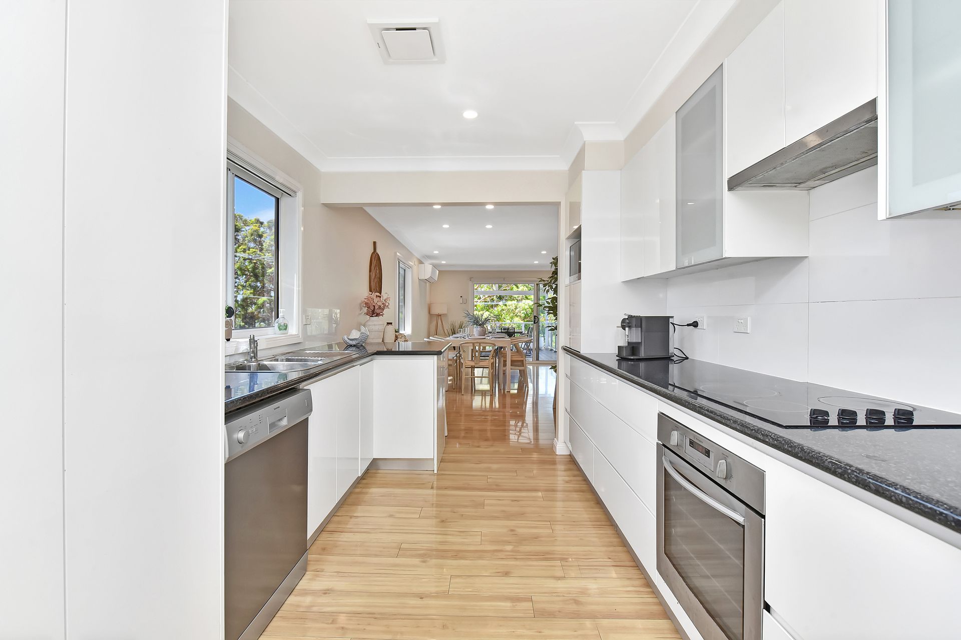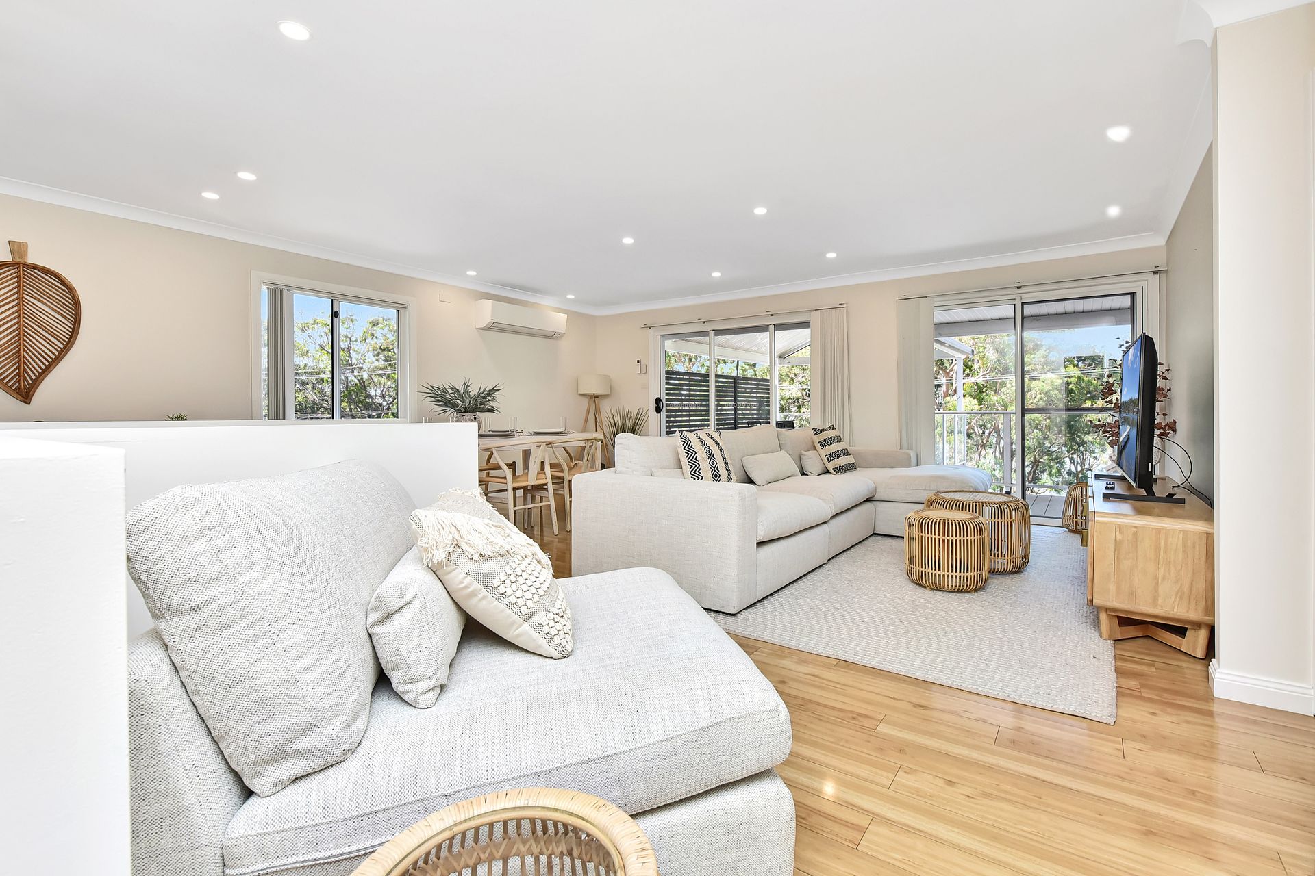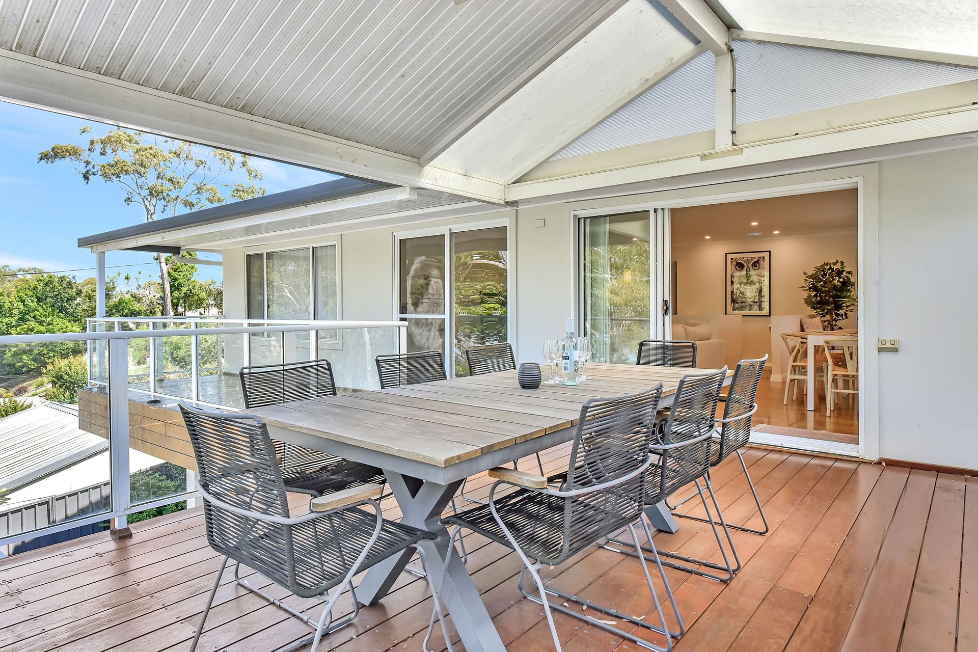 Designed for both comfort and style, the home includes multiple living areas, a large kitchen flowing seamlessly to indoor and outdoor dining spaces, ducted air-conditioning, and a generous entertaining deck with stunning water views—ideal for families or groups.